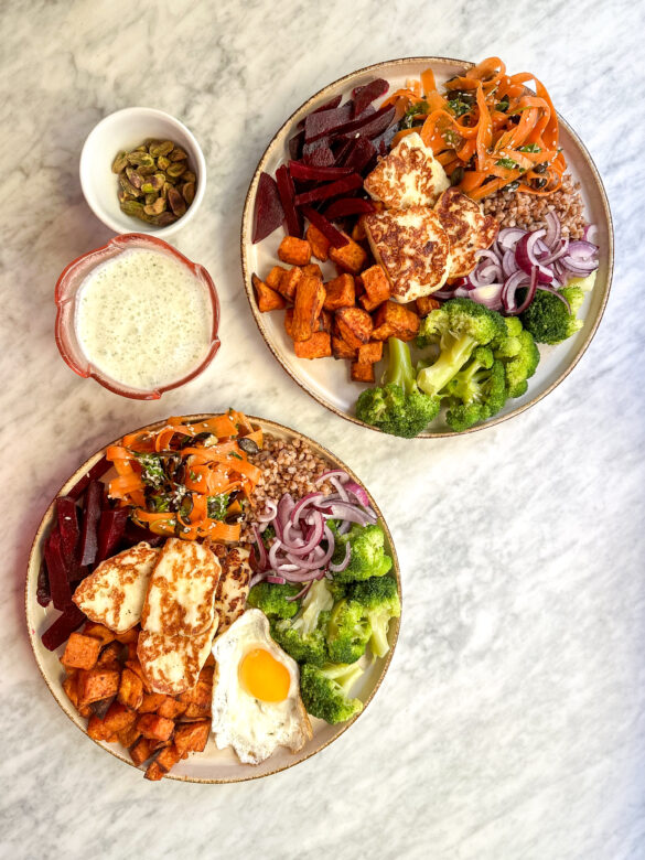 Brokuła podziel na różyczki i ugotuj w delikatnie osolonej wodzie lub na parze. Ugotowanego buraka pokrój w słupki. Cebulę pokrój w piórka. Marchewkę pokrój za pomocą ostrej obieraczki do warzyw we wstążki, a następnie zanurz ją na chwilę w misce z lodowatą wodą. Na suchej patelni upraż pestki dyni i ziarna sezamu. Marchewkę odsącz z wody, dodaj uprażone pestki, posiekany pęczek kolendry, 2 łyżki oleju sezamowego, 2-3 łyżki sosu sojowego i 1-2 łyżki octu jabłkowego. Wymieszaj wszystko dokładnie. Ser halloumi usmaż na złoty kolor na suchej patelni. Kaszę gryczaną ugotuj do miękkości w osolonej wodzie. Możesz też dodać pół łyżeczki gotowego bulionu z dobrym składem. Orzechy posiekaj i również upraż na suchej patelni. Na koniec przygotuj sos jogurtowy. Wymieszaj jogurt, posiekane listki mięty, 1 łyżeczkę koperku (może być suszony), szczyptę soli, pieprzu i 1 łyżkę soku z cytryny. Jeśli chcesz, przygotuj jeszcze jajka sadzone.
